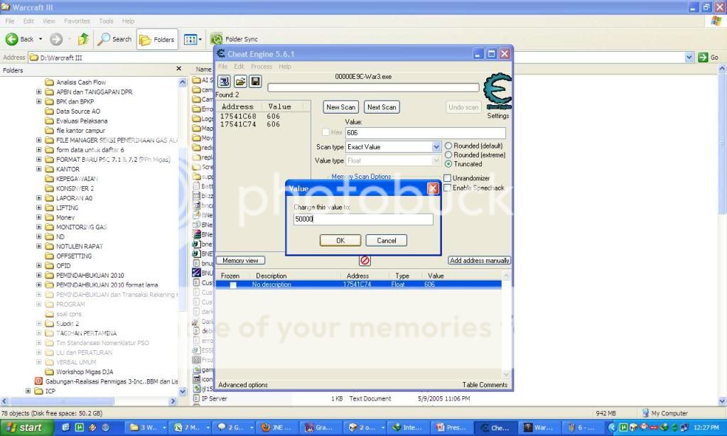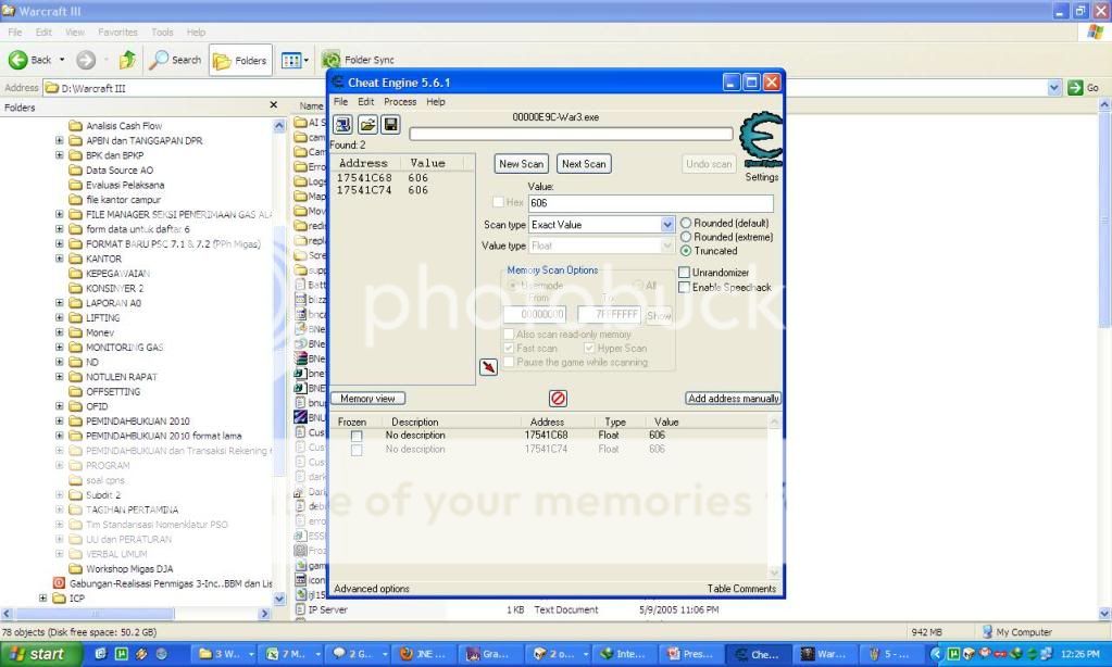 6) sekarang kita alt+tab lagi... kembali ke program Cheat Engine... kita ganti angka di kolom value menjadi 606 (hasil perubahan HP Centaur karena item ironwood branch) dan klik "next scan"... nah ketemu deh addressnya... di sini ada 2 address.. yang 1 maximal HP om Centaur... yang 1 lagi current HP om Centaur...